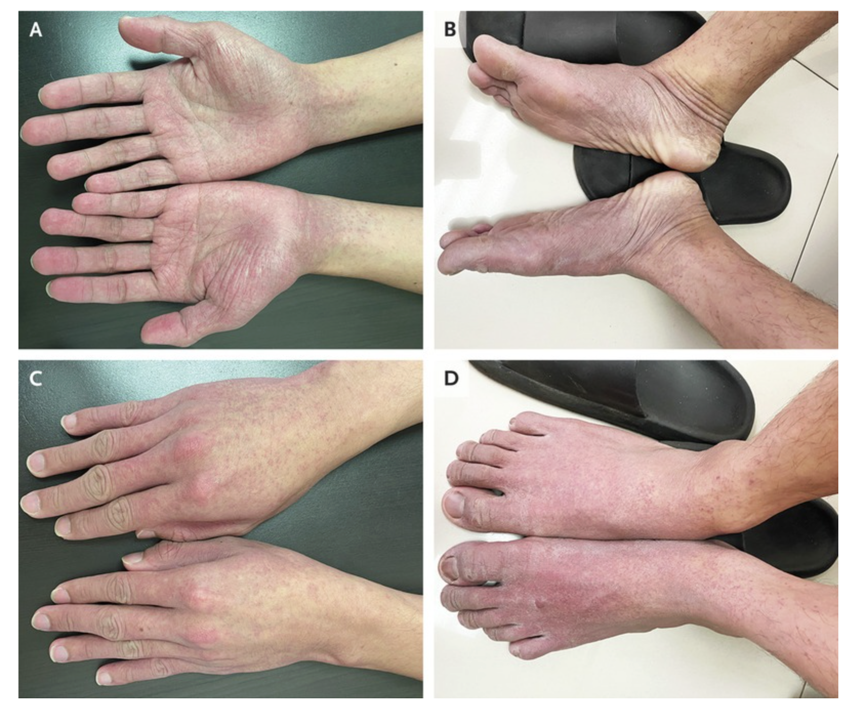 Il existe une forme particulière, l’éruption dite en “gants et chaussettes”. Il s’agit d’une éruption papulo-purpurique (“plaque” en relief centimétrique palpable et qui ne s’efface pas à la vitropression).