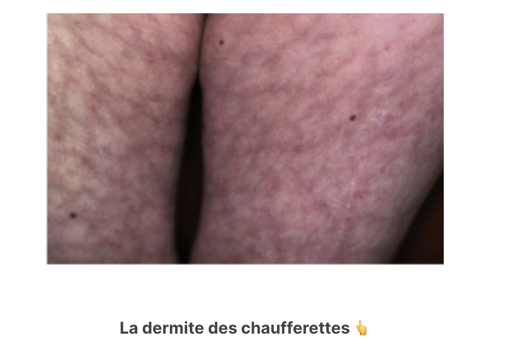Et c’est parfois le fait de se réchauffer qui déclenche un autre type de réaction : la dermite des chaufferettes, un livedo non inflammatoire fait de mailles régulières (arrive typiquement en se collant les jambes contre un radiateur chaud ou une bouillotte sur le ventre) : c’est une manifestation totalement bénigne qui disparaît spontanément.